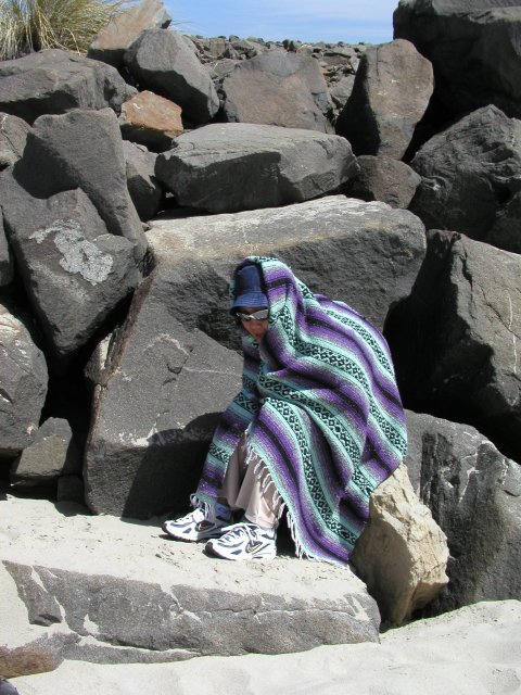Mhila braving the wind at Florence, OR, August 7, 2005 (P8070494)